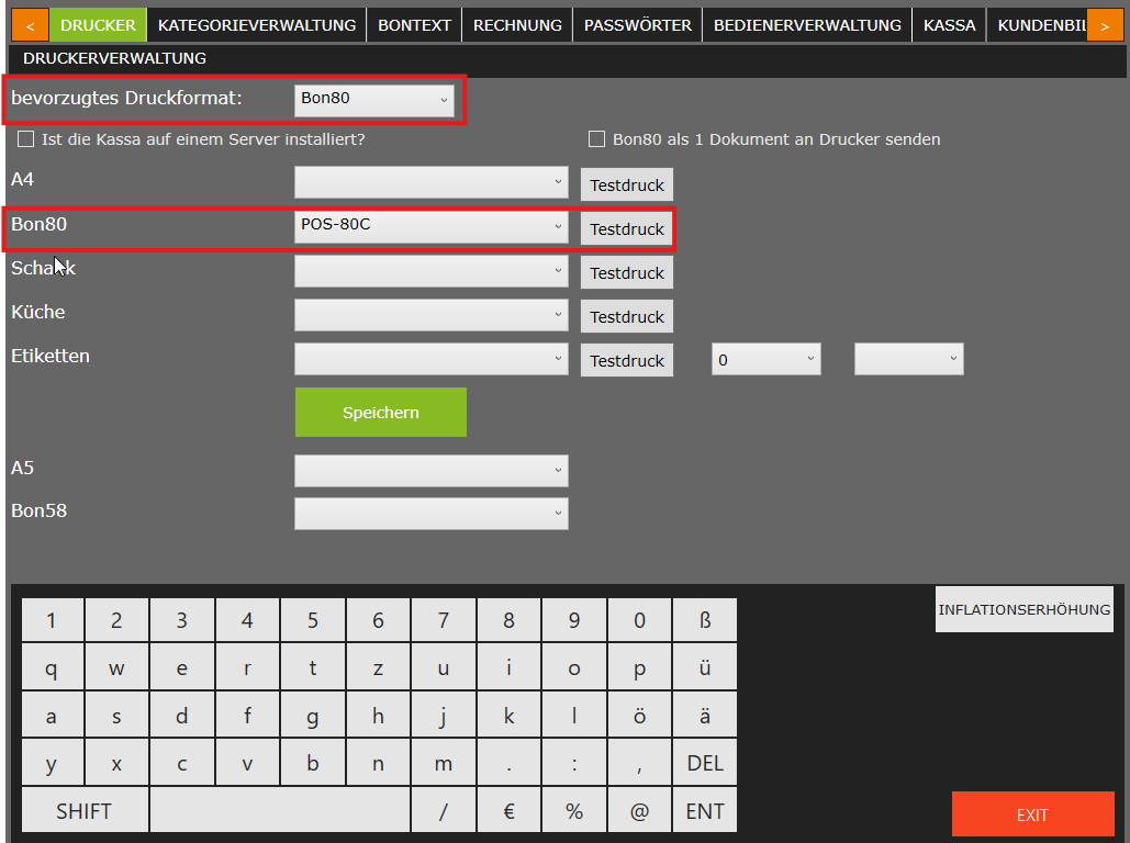 - Stellen Sie sicher das der Bondrucker im Appinnovo korrekt hinterlegt ist. Dazu müssen Sie auf der Startseite vom Appinnovo den Button „Erweitert“ klicken. Als bevorzugtes Druckformat sollte Bon80 ausgewählt sein und bei der Option Bon80 muss der korrekte Bondrucker hinterlegt sein! (!) Bei jeder Korrektur der Einstellungen müssen die Änderungen immer gespeichert werden! (Grüne „Speichern“ Taste)